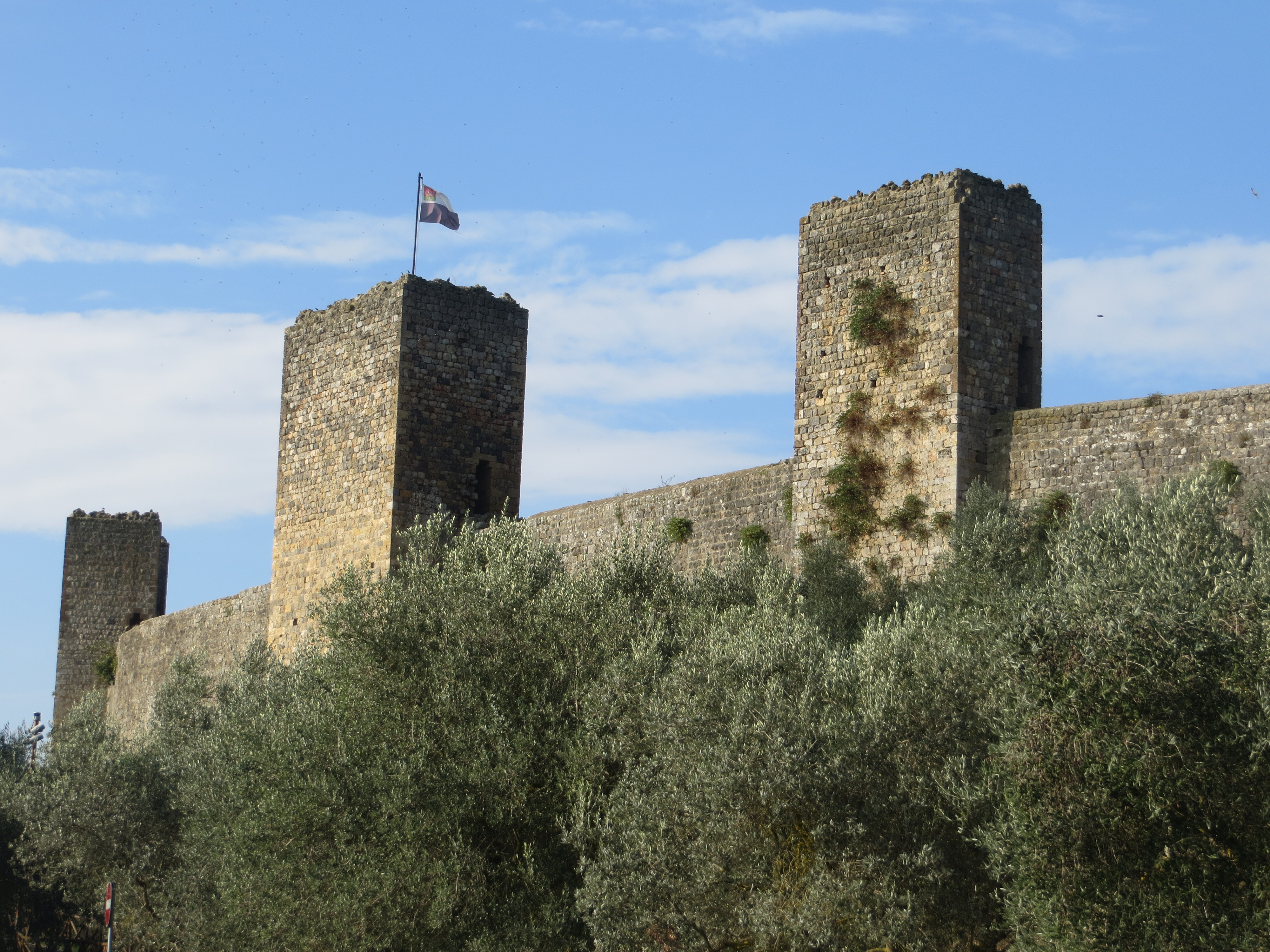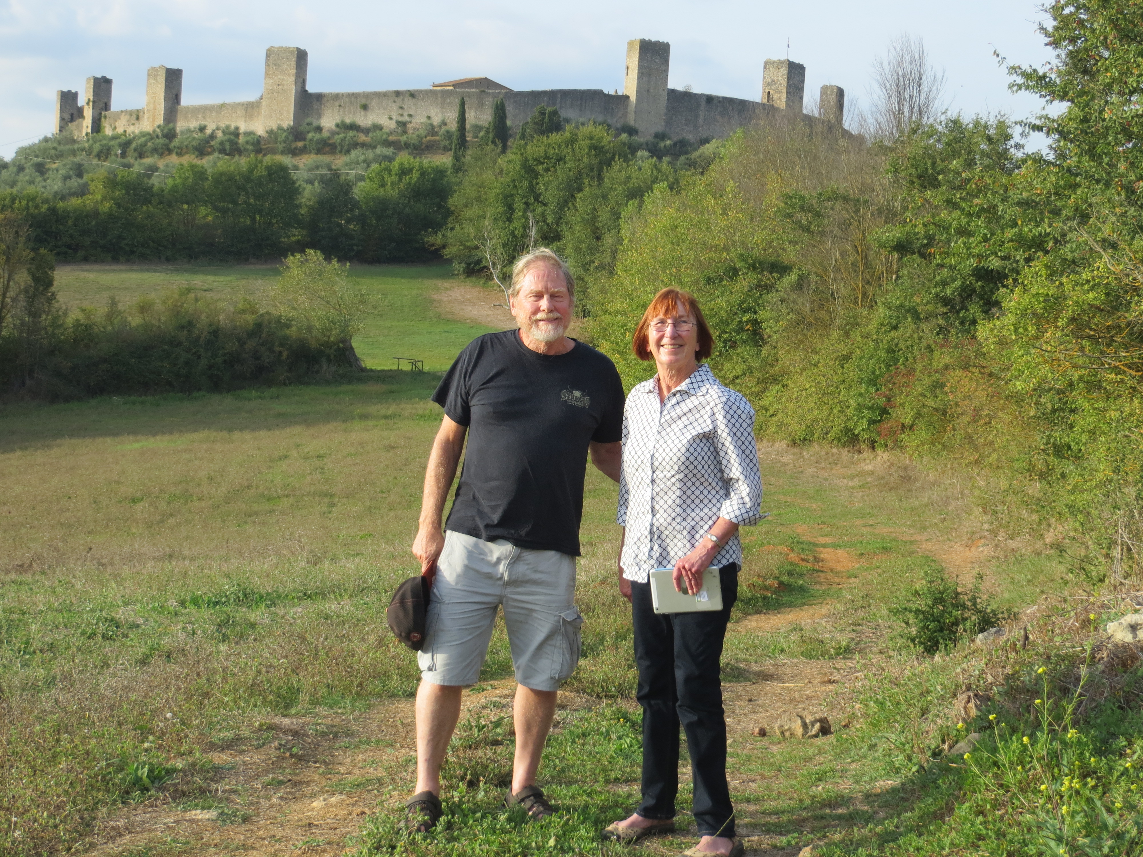 After strolling through the streets of the San Gimignano fortress and having lunch on a veranda overlooking the distant countryside we drove on towards Siena. John was looking for a “agro-tourism” B&B as we cruised the backroads. Nearing Siena we found a prominent fortress dominating the skyline so naturally we headed straight for it: Monteriggioni.