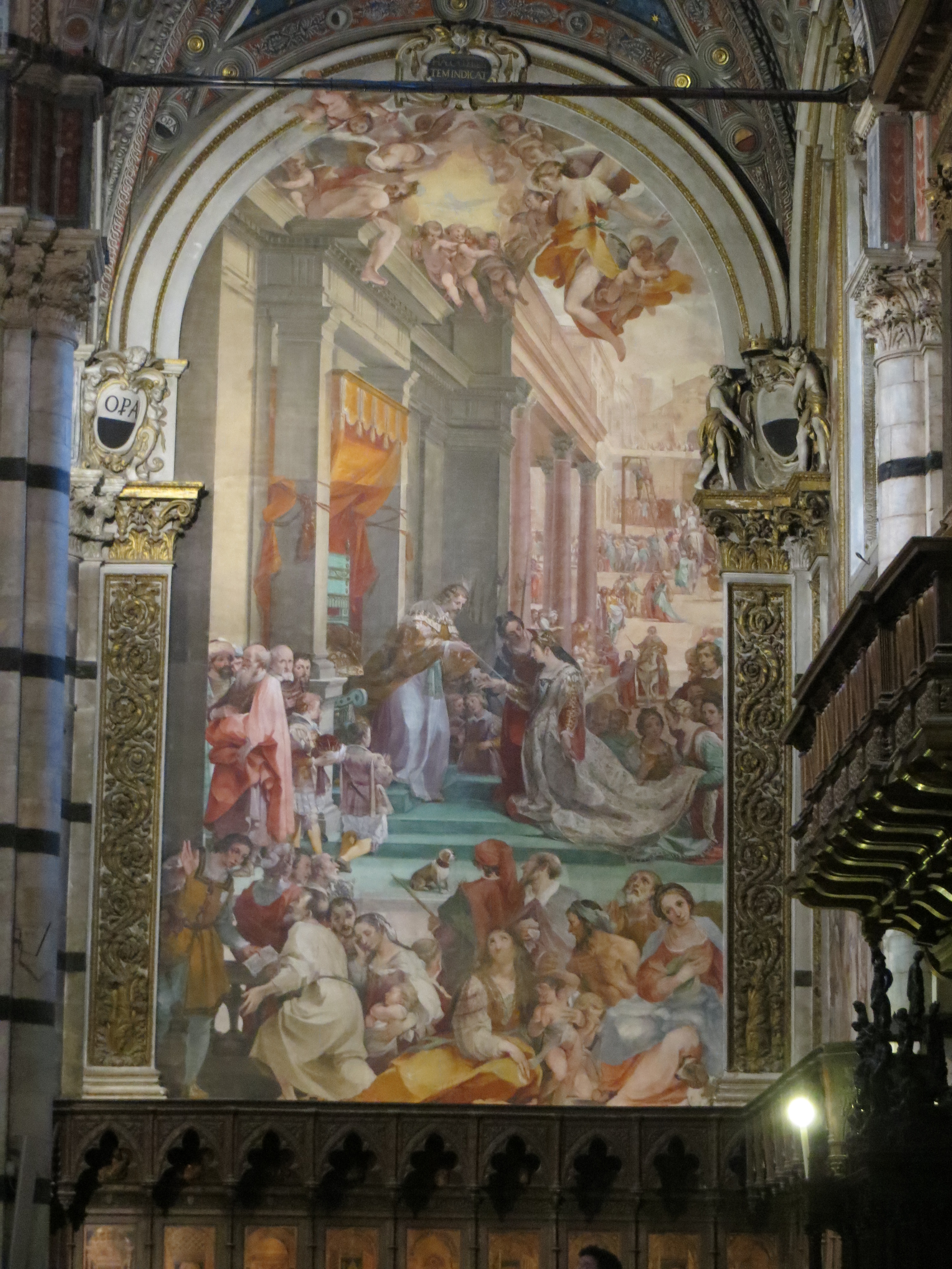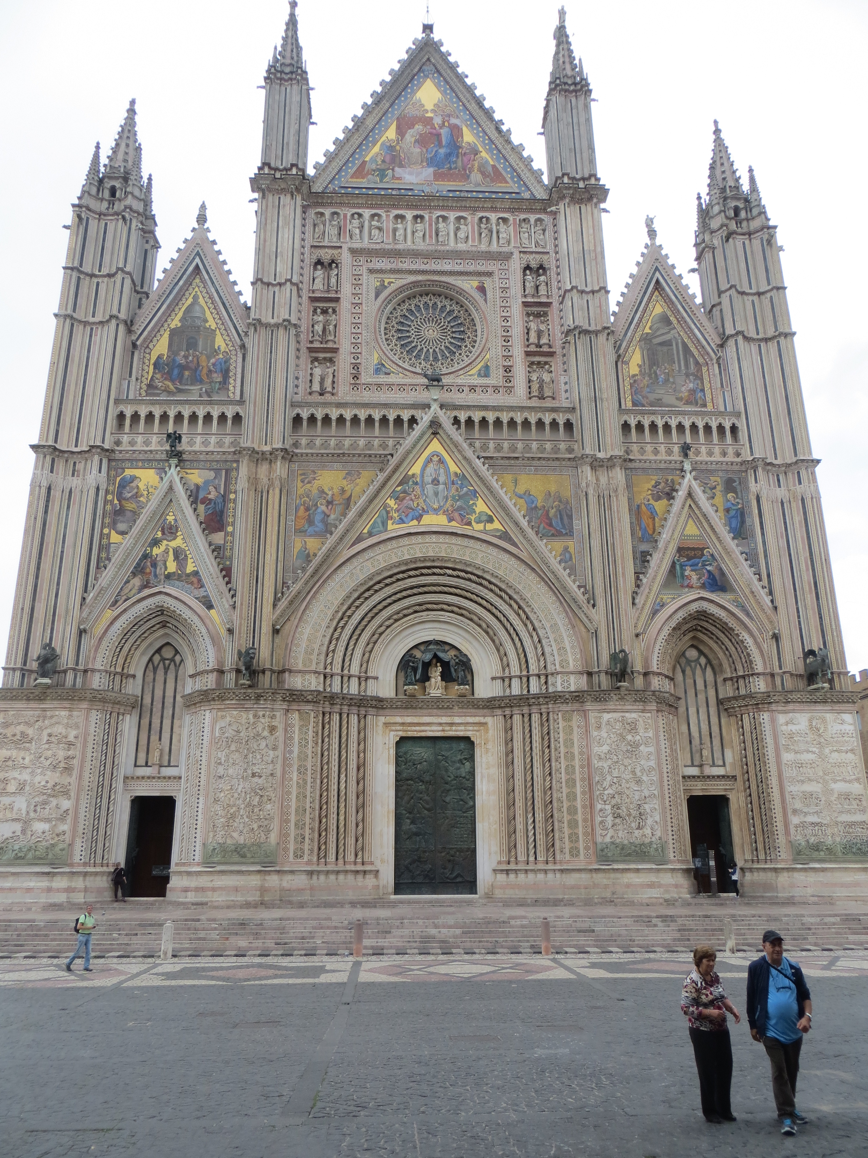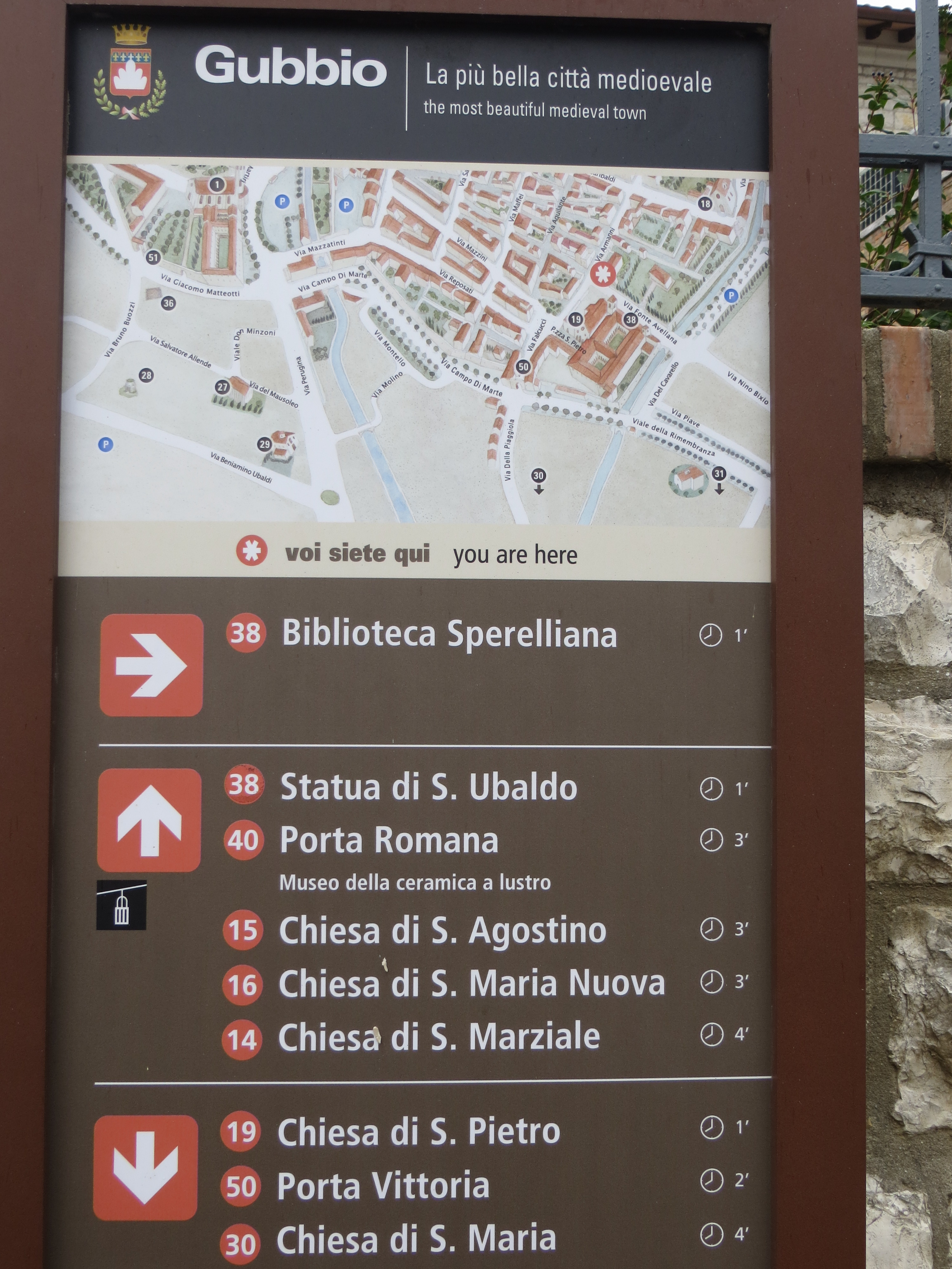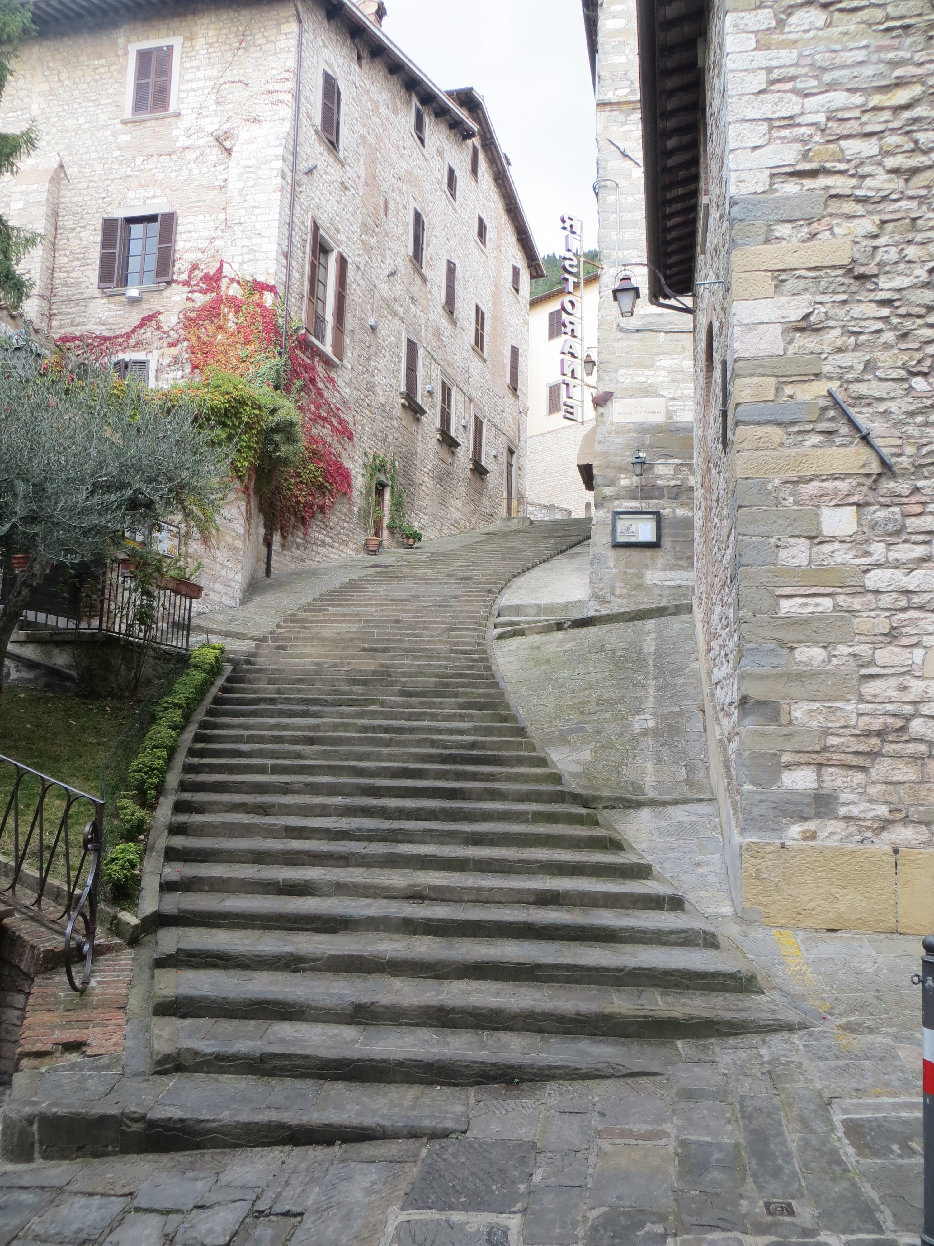 The road led us through a range of steep hills northeast to Gubbio, an ancient hill-side town in Umbria. We got there around noon and found it to be charming and off the beaten tourist track. We wandered the town for awhile dodging rain showers and found the main square in front of one of the earliest public buildings in Italy, Palazzo dei Consoli. From Wikipedia: Gubbio was “made famous for the discovery there of the Eugubine (or Iguvine) Tables, a set of bronze tablets that together constitute the largest surviving text in ancient Umbrian. After the Roman conquest in the 2nd century BC — it kept its name as Iguvium — the city remained important, as attested by its Roman theatre, the second-largest surviving in the world.”
