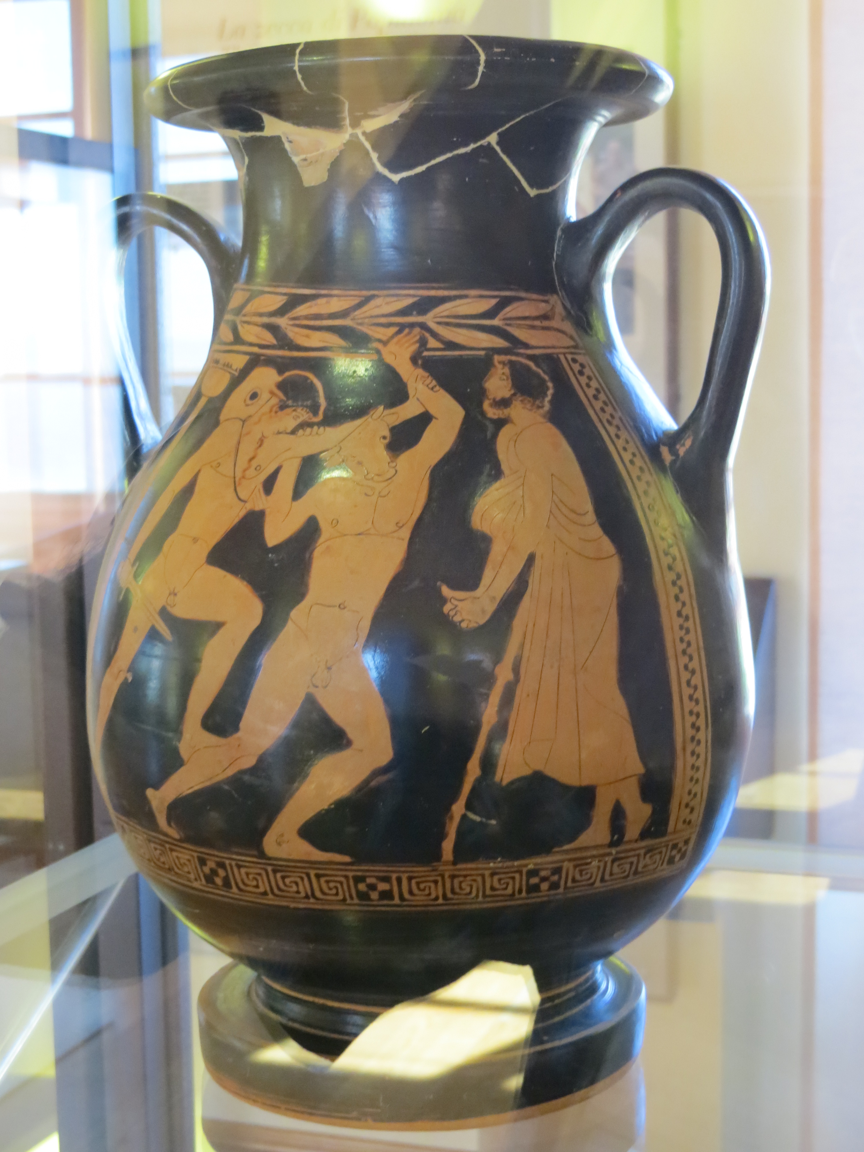 Along with the Etruscan, Greek & Roman artifacts, two particularly interesting objects were on display.  First was an “early first century” mosaic from the Roman Acropolis Le Logge at Populonia depicting a shipwreck in an underwater setting with fish & crabs.  (This also had an interesting backstory, including being damaged in a traffic accident and a its recovery in 1995 after being illegally exported.) The second object, L’anfora di Baratti  was a large silver amphora (vase) which was found by accident stuck to an anchor off the near-by coast.