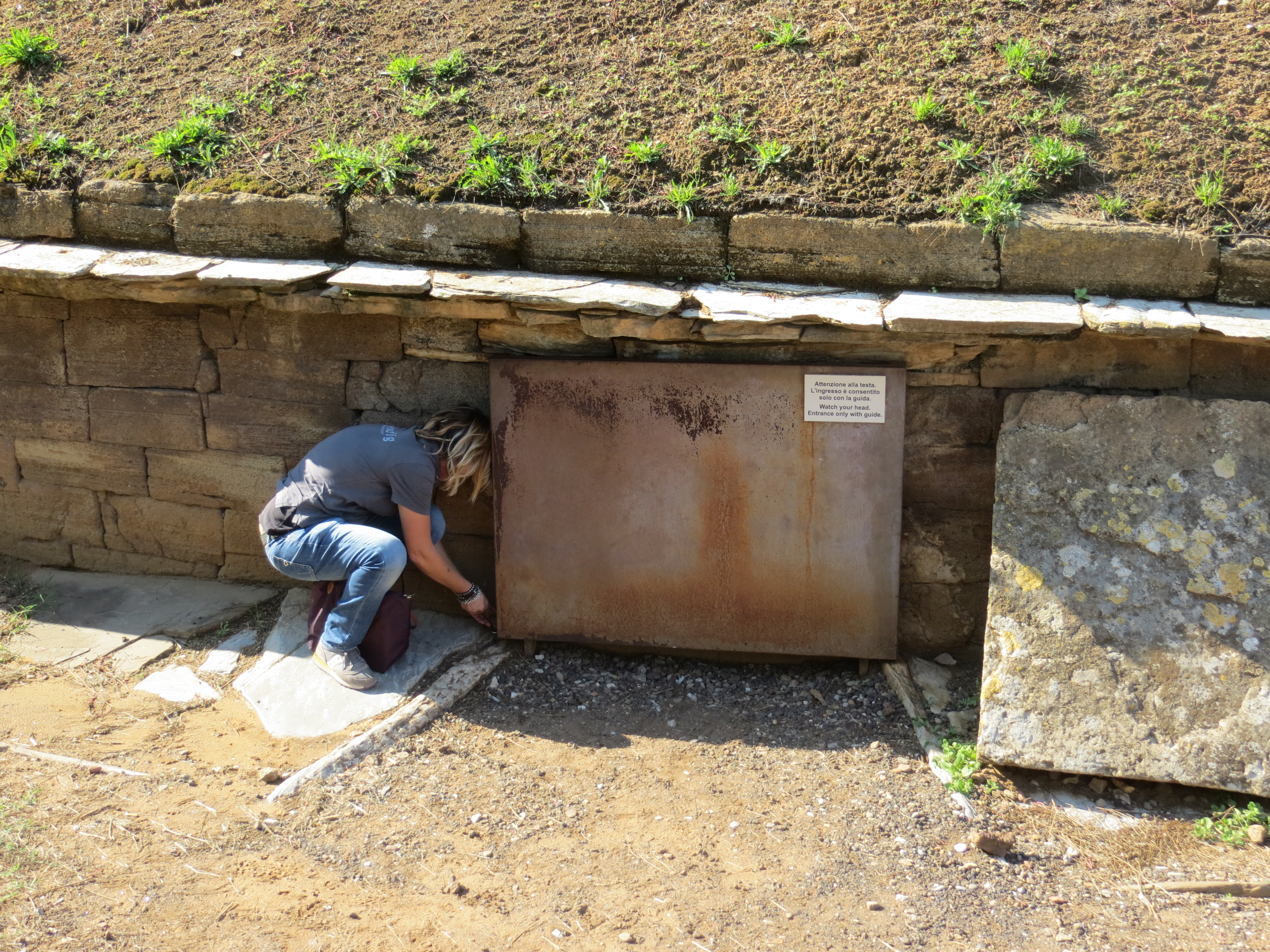 The first and largest  tomb in the San Cerbone necropolis is called “Tomba dei Carri”.  This oval ‘Tumulus type’ dome is listed at 30 metres in diameter, and looked maybe 7m high.  [Guidebook: from “Orientalizing Period  (7th century BC)”.]  It had about a 5′ wall around its base with a narrow access doorway about 3′ high that was locked behind a heavy vault door.  And Dr Carolina Megale had the key to the vault.