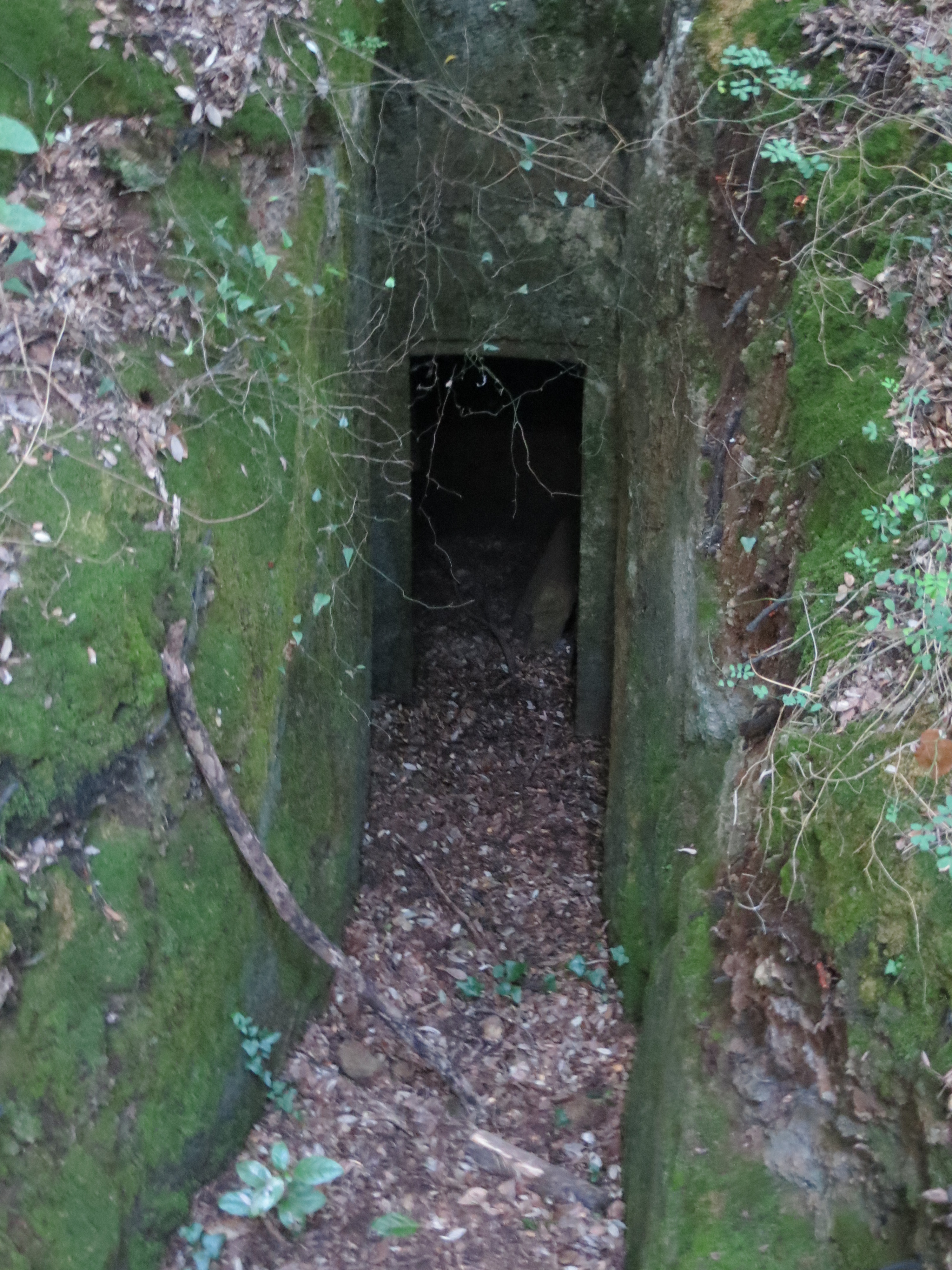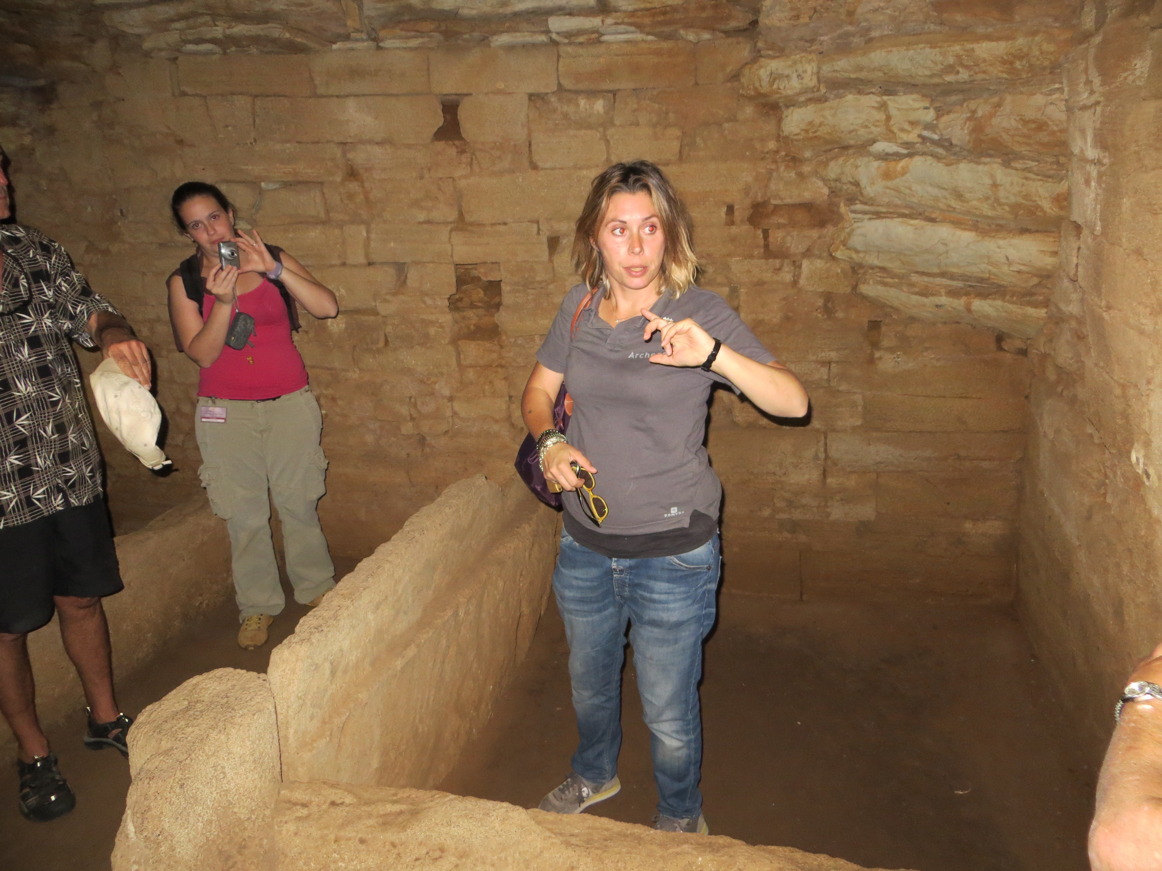 With the door pulled open & Carolina’s encouragement we crouched our way into the Tomba dei Carri and found a large squarish room in the center with a high conical roof (partially reconstructed).  I think that Carolina had turned on the interior lights.  There were some low partitions which might have been funeral beds.  In a side room of this tomb, when it was first uncovered, was found an intact chariot, now on display in a distant museum.  We didn’t see anything laying around but didn’t linger long inside those chambers.