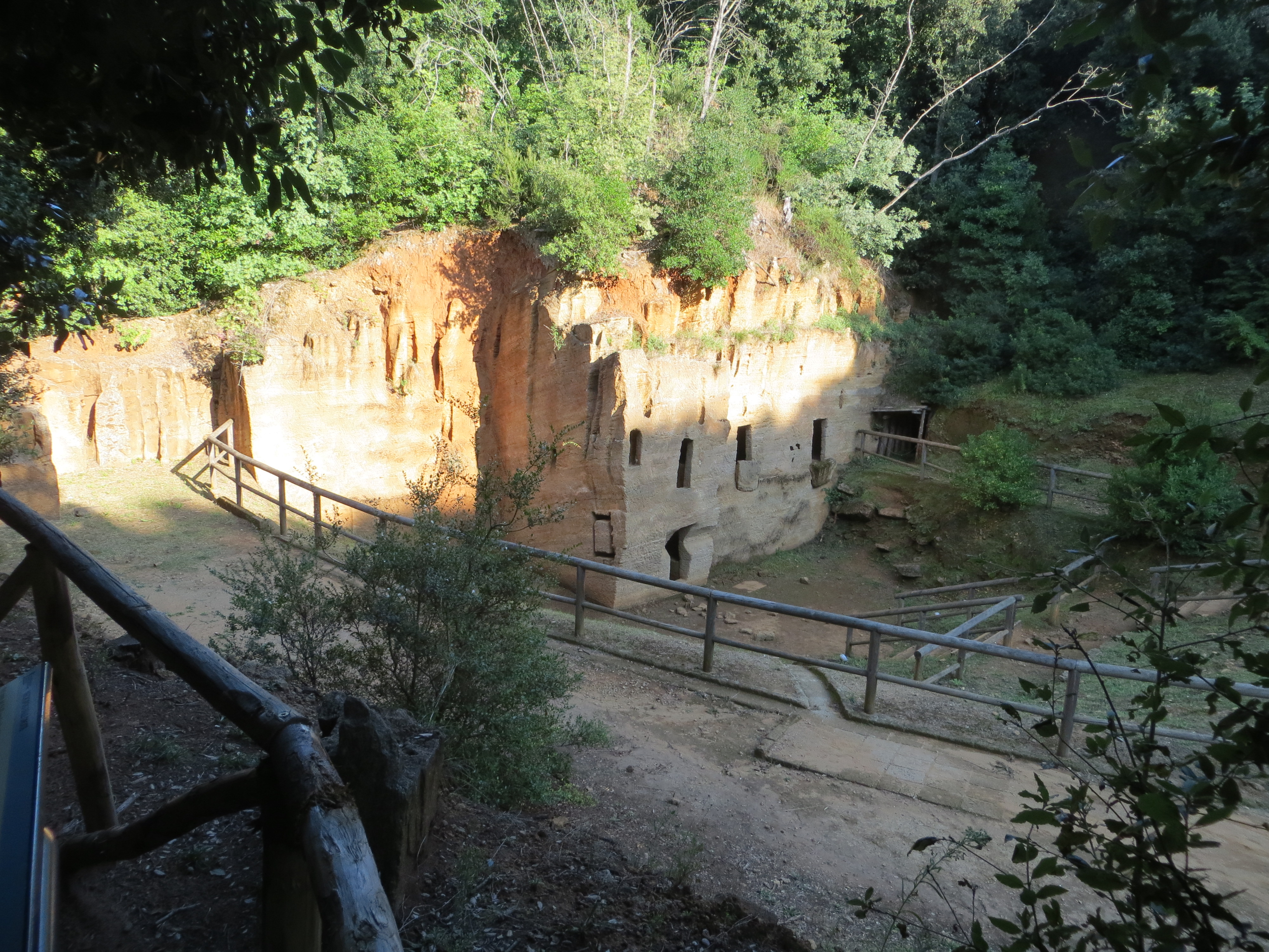 Then we headed up the hills to the Via delle Cave and the Cava delle Grotte.  These are tombs built into the sandstone hills and in the quarry.  It was a steep climb to these unique burial chambers.  High on the sloping hillside were dozens of narrow slots cut through solid rock leading to a small burial chamber.  On the other side of that hill were two levels of chambers cut into a quarry wall, like a townhome.