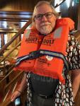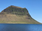 John illustrates life jacket; hills around town with cottony fog; our motor silver (sails not up yet); Kirkjufell (church mountain); town with kids jogging down the road.