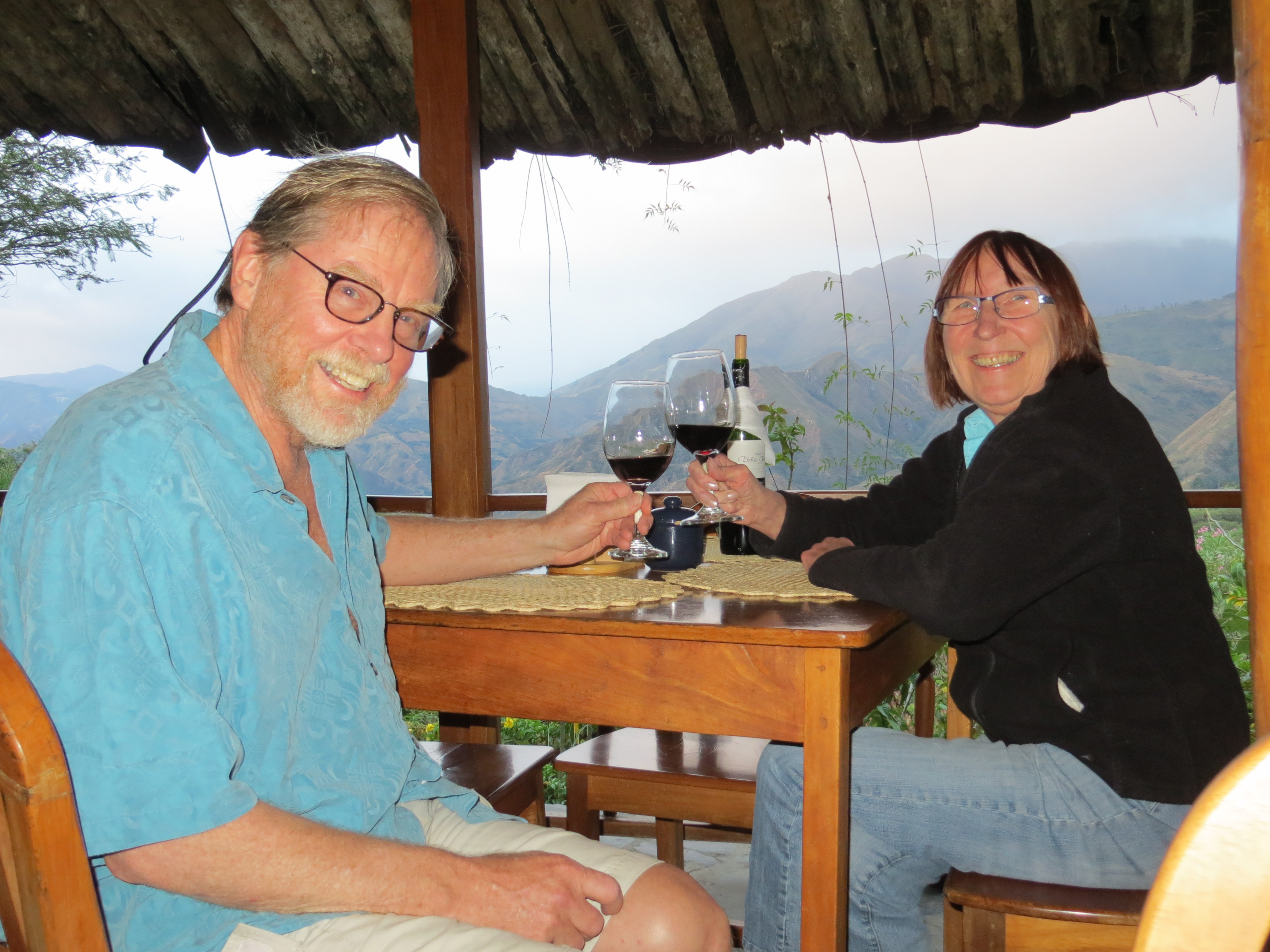 Izhcayluma is about 10 minutes outside of Vilcabamba, but we were delayed about 20 minutes by road construction where they we laying out a new stretch of concrete highway to complete a link to the Peru border. Izhcayluma is owned by Germans and has lush gardens, a pool, a bar and wi-fi. We were given a nice room, at $45/night including breakfast, in a cottage with a private deck overlooking a hillside and a hammock. The hotel has an open-sided dining pavilion with views of the Vilcabamba valley and serves a delicious menu with choices of Ecuadorian and German dishes. It was warm enough that we left the door to our room’s deck open all night, but it seemed to have a constant breeze with strong gusts from time to time.