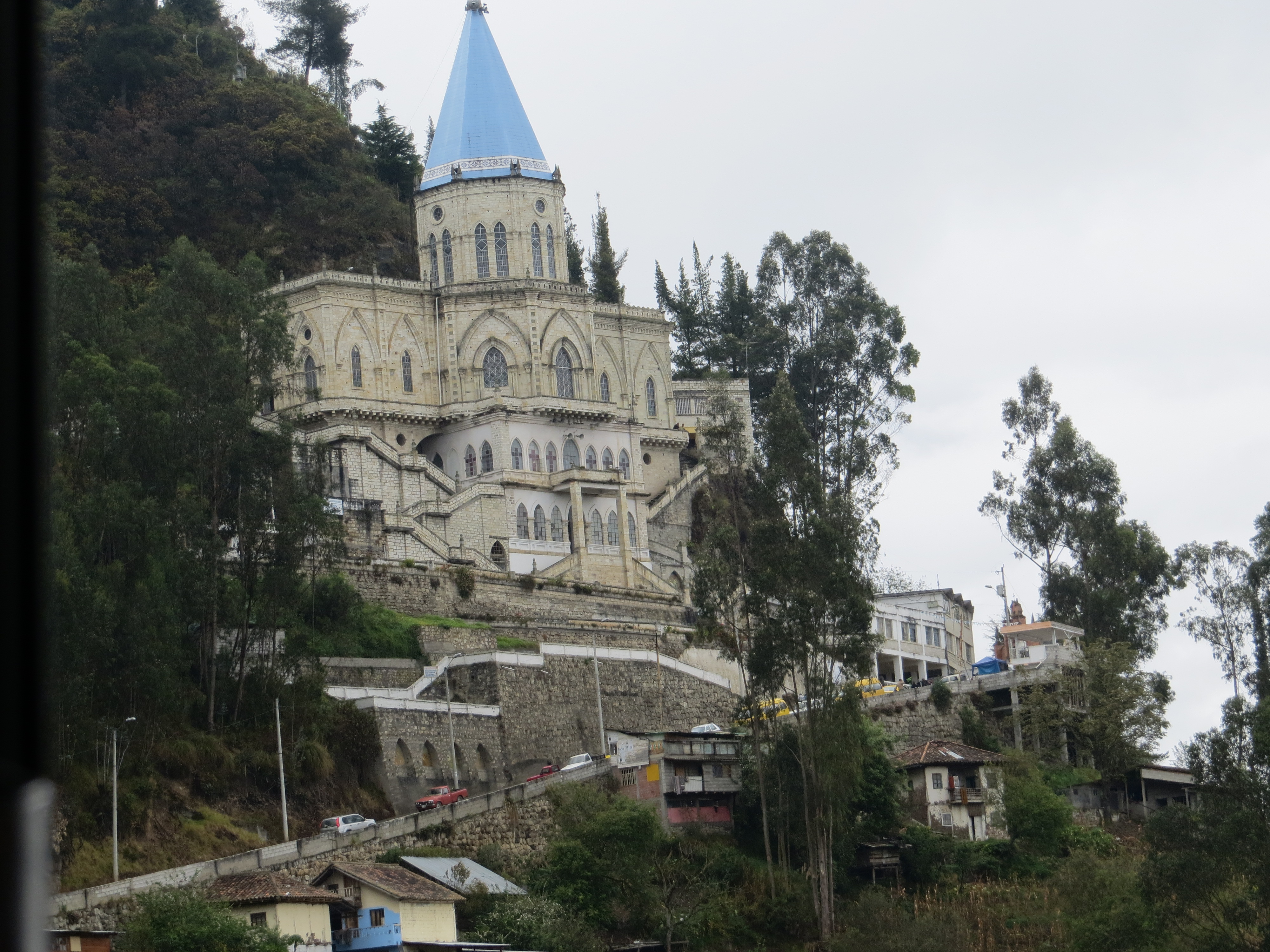 Virgen del Rocio (Sactuary of the Virgin of the Dew) built on an Cañari and Inka temple site integrated onto a stone hillside high above the town of Biblian.